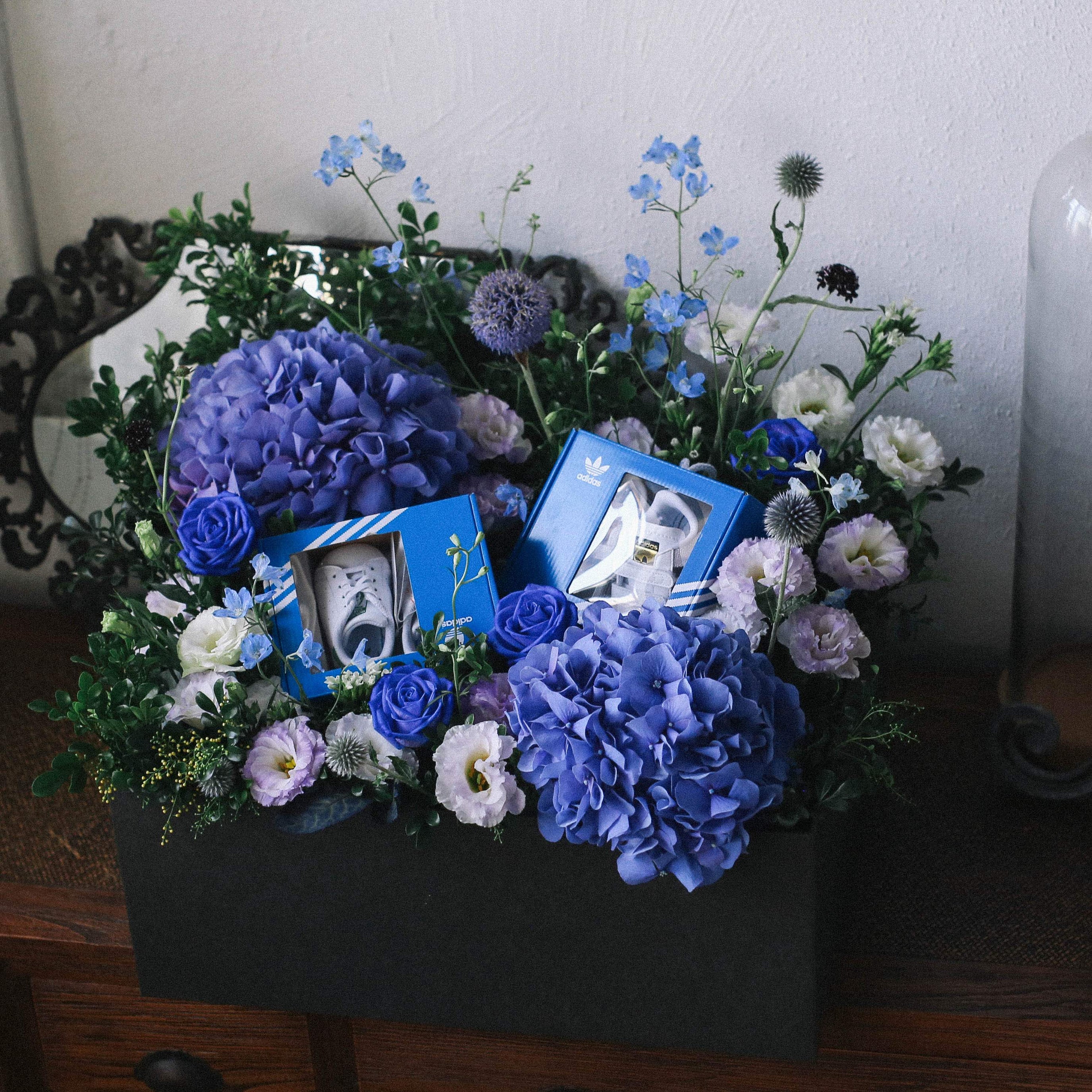 用上嬌嫩的日本飛燕草、小蔥花、藍玫瑰、粉紫桔梗與荷蘭大繡球,拼湊出夢幻又恬靜的奢華花盒。