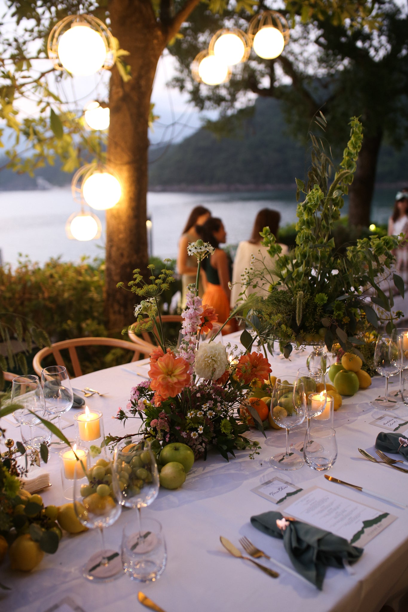 在屋內的每一個角落,以Cloudy Bay的美酒為主,用心設計花藝作品。例如於餐桌上不同獨特形態的花材,如嫩綠色的貝殼花和Dahlia 配以如噴泉形態般的知風草等,伴著入口充滿着中杏桃花的香氣,又帶些許熱帶水果味道的Sauvignon Blanc2023,清爽無比。各種配搭讓人仿如遊走於探險之地,沉醉於花香和果香之間,在繁花與燭色襯托之下,恍如身處在New Zealand海色的浪漫之境。
