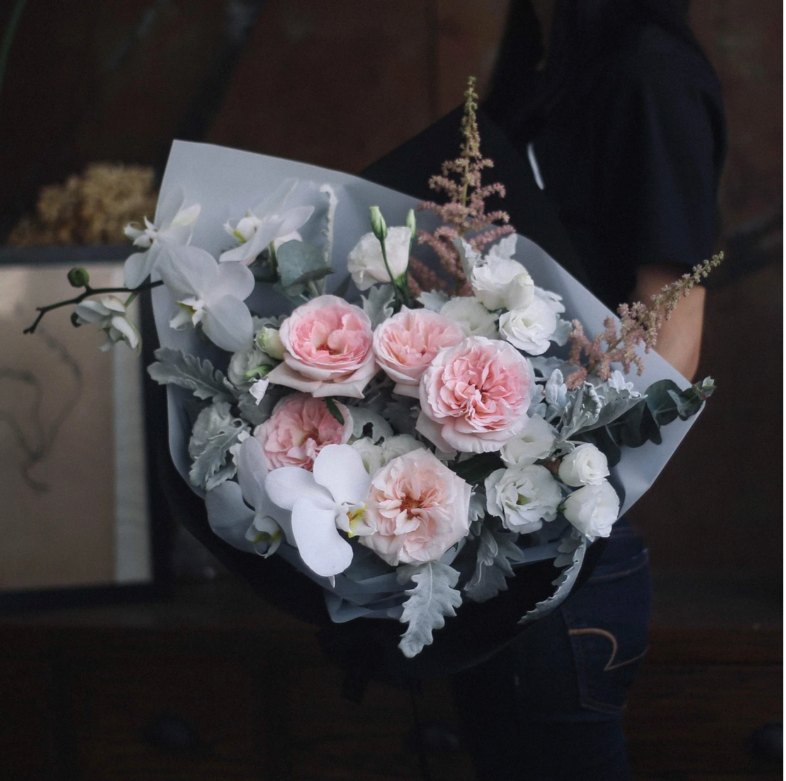 以香水玫 Ohara 以及香色蘭花為主花,配襯上香桔梗與粉紅雪山,特顯奢華品味。