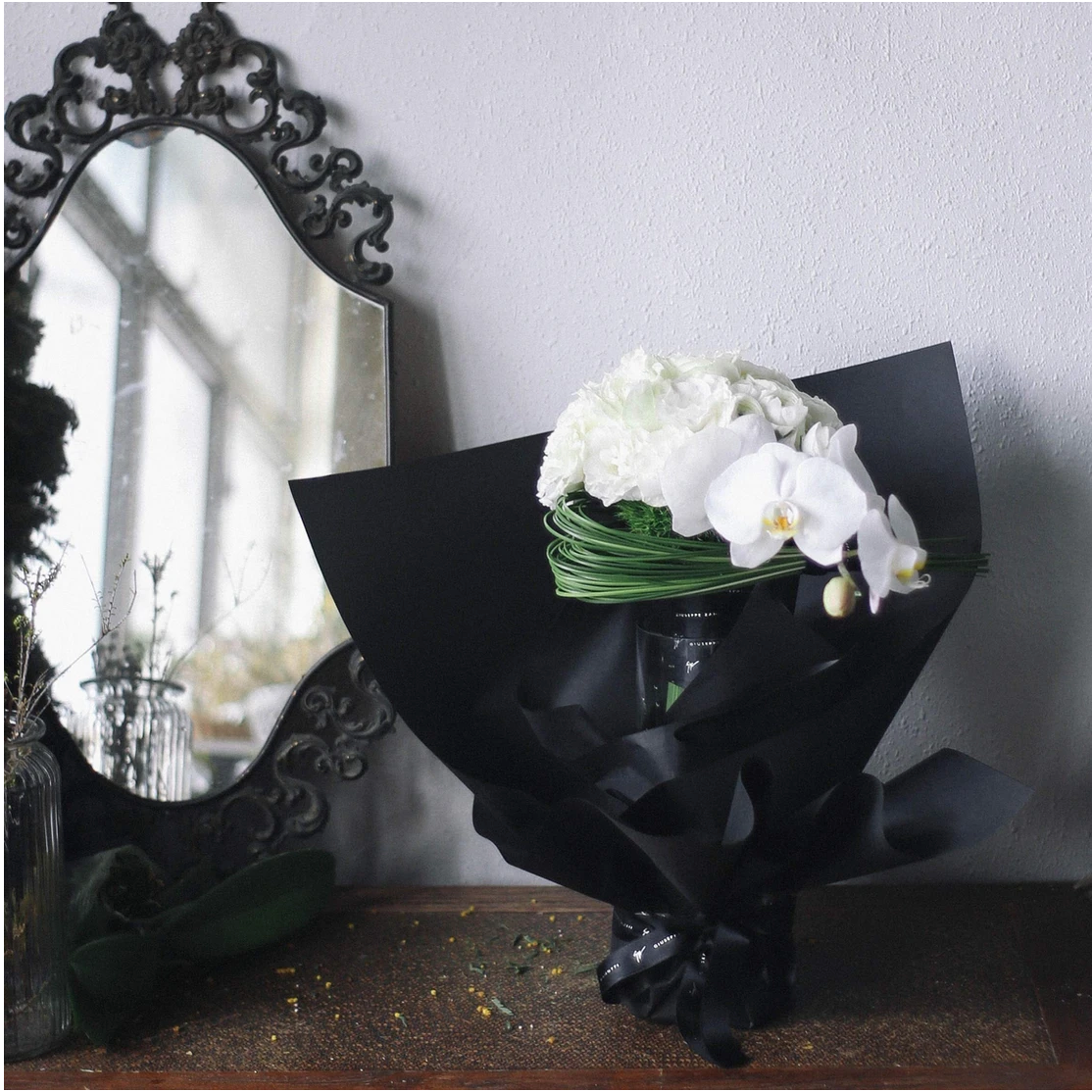 用上能開得像臉龐一樣大的 Tineke 白玫瑰,配襯著小牡丹與桔梗花,質感細膩悅目。白色的蘭花更像嬌美的耳墜兒,把整個花藝作品烘托得更具氣派!