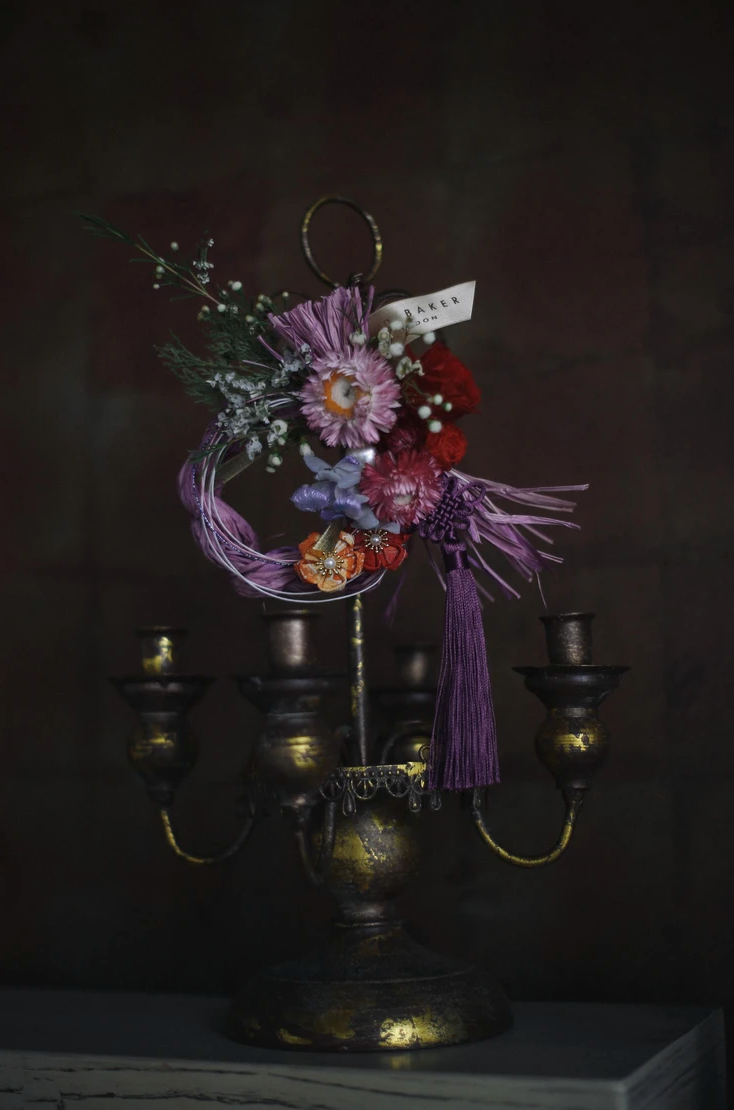 以「團圓」為主題的農曆新年花環設計。 ➖ 將來自馬達加斯加的拉菲草,染上迷人的紫調,再以人手綑成具有祝福意義的草環,日本水印線則用作豐富層次的點綴。妝點著保鮮玫瑰與繡球花寓意花團錦簇,花開永富!手作的布藝桃花與如意結,更加添農曆新年氣氛。